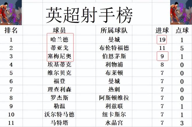 射手榜方面,哈兰德本轮哑火,还是19球高居榜首,比第2的蒂亚戈多了8球之多。塞梅尼奥破荒找回状态后,近几轮是连连进球,今天又打入一球的他超过埃基蒂克1球,9球独居第3。沃尔特马德,福登,理查利森等人7球刚好挤入前十。